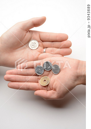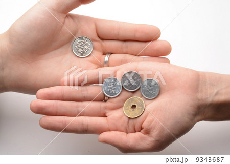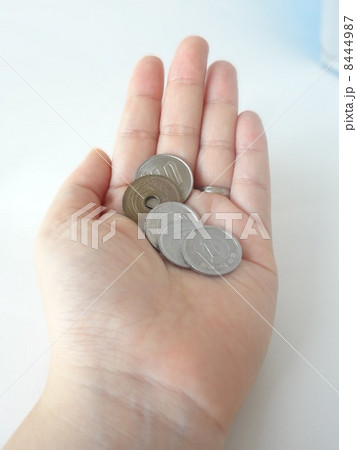 108円を持つ主婦の手 硬貨 消費税8%