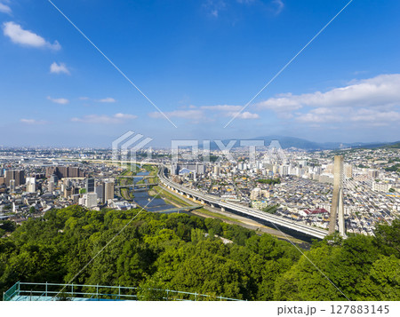 五月山から見る夏の青空と街の風景