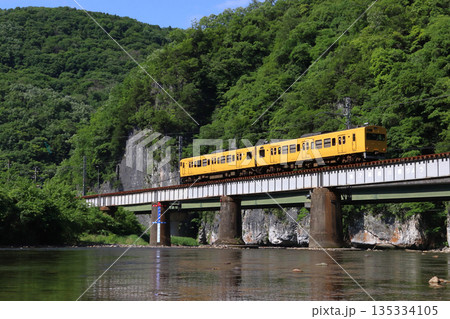 新緑の高梁川を渡る伯備線115系2両編成