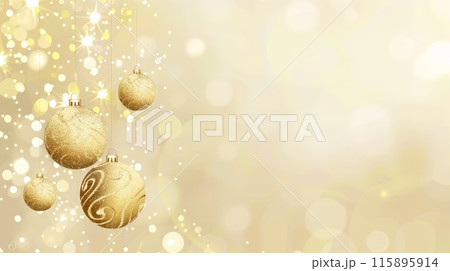 Golden Christmas ornaments with sparkling lights and a soft bokeh background, creating a festive and elegant holiday scene.