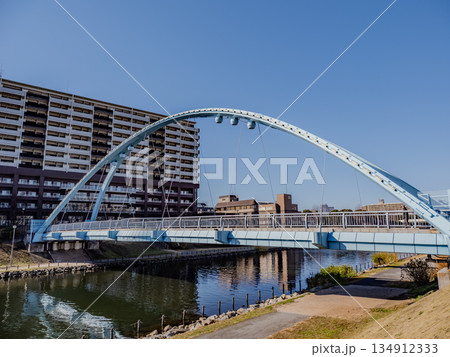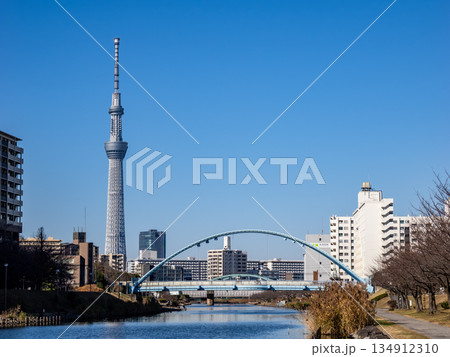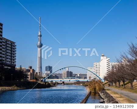 旧中川に架かる「ふれあい橋」と東京スカイツリーが見える風景