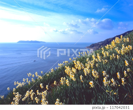 「日本三大水仙の自生地」灘黒岩水仙郷のスイセンと沼島、漁の舟/淡路島の早春 /兵庫県南あわじ市