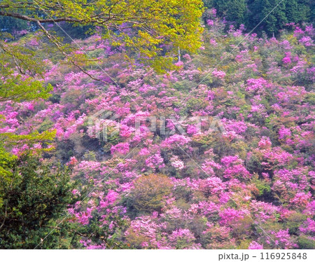 京都、高雄・槙尾山(まきのおさん/西明寺の裏山)のミツバツツジの大群生 「周山街道の春景色」