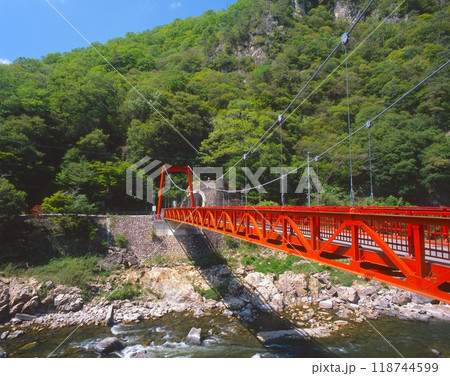 武田尾温泉、真っ赤な武田尾橋と武庫川渓谷と新緑 /兵庫県宝塚市、西宮市