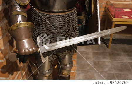 The knight in his hand holds a sword and shield. Protecting warriors during battle in ancient times, close-up