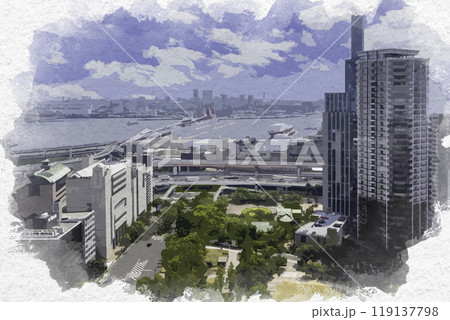 水彩画風 神戸 神戸市役所からポートアイランドを望む 兵庫県神戸市