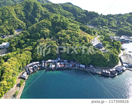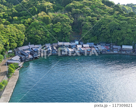 京都府伊根町伊根湾沿岸の舟屋群の空撮