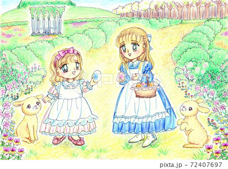 復活祭の庭の子供達 うさぎとエッグハント 手描き 色鉛筆