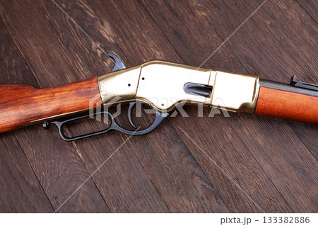 Old west gun - lever-action repeating rifles with ammunition and silver dollar coins.