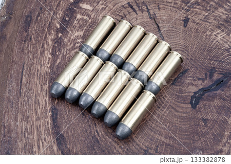 Old West era Long Colt .45 caliber revolver cartridges on a wooden table