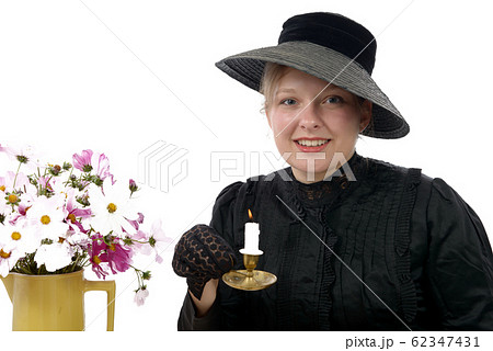 young woman in vintage costume 1900s with candle
