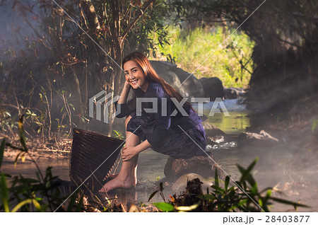 Portrait of beautiful Village women sitting and washing the clothes at the stream of waterfall or river, countryside and Folkways concept