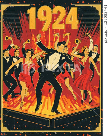Dancers and musicians celebrate with energetic performances in a retro-themed party set in 1924. The vibrant colors and dynamic poses highlight the excitement and joy of that era.