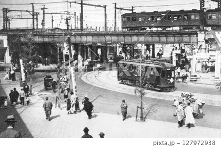 古写真 1932年 東京 新宿三丁目 明治通りの伊勢丹前