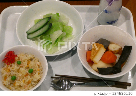 岩手県の1975年頃の学校給食の五目ご飯、おでん、サラダ、牛乳