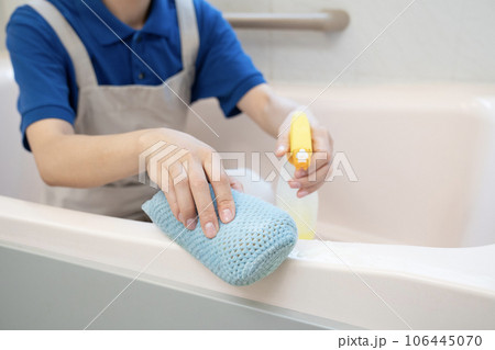 浴室の清掃をするハウスクリーニングの女性作業員の手元