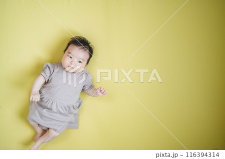 黄色い床に寝転ぶ赤ちゃん