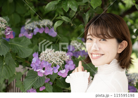 ガク紫陽花と微笑む女性