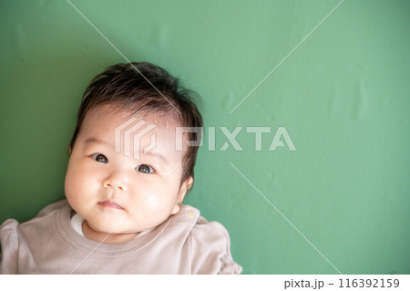 グリーンバックの背景で横になってる赤ちゃん