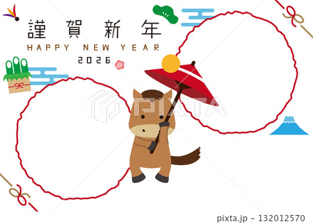2026年賀 傘回し白馬 年賀状 2つの丸背景白のフォトフレーム