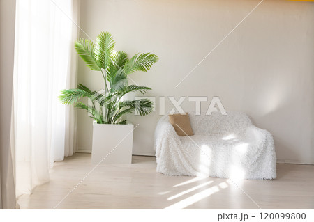 White sofa with flowers and gifts for the holiday in the interior of the white room