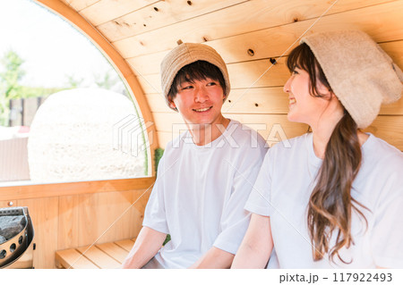 サウナに入って楽しく会話するTシャツ姿のカップルの若い男女