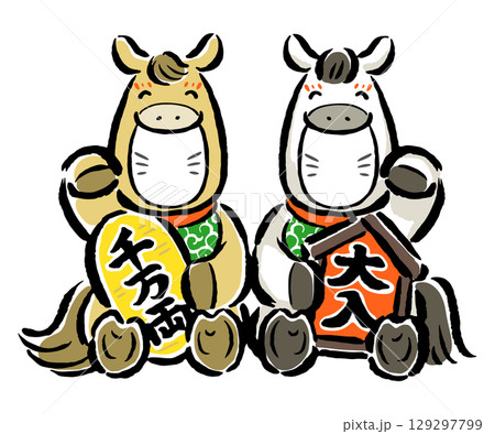 顔はめ年賀状素材2人用 招き猫の真似をする干支の馬(午)たち