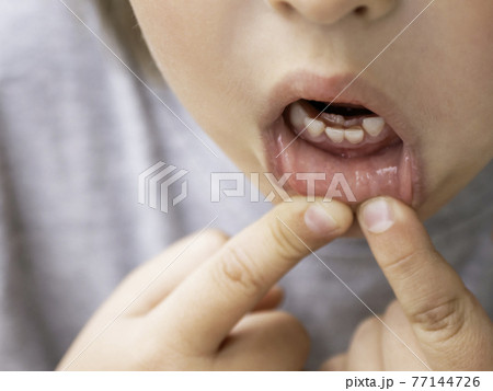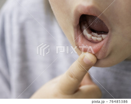 Little kid shows double row of teeth in his month. Molars grew before milk teeth fell out. One bottom incisor fell out just now. Close up photo of gums for dentist.