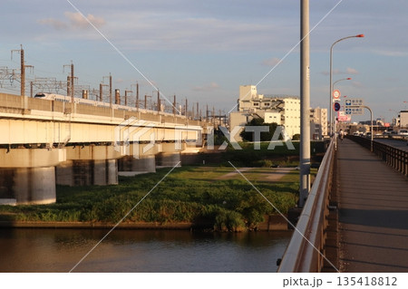 夕暮れの戸田橋を行く東北新幹線E2系(埼玉県戸田市)