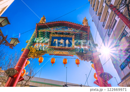 日本の横浜都市景観2月玄武のカラフルな飾りが登場した横浜中華街・玄武門などを望む=令和7年2月1日