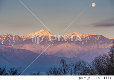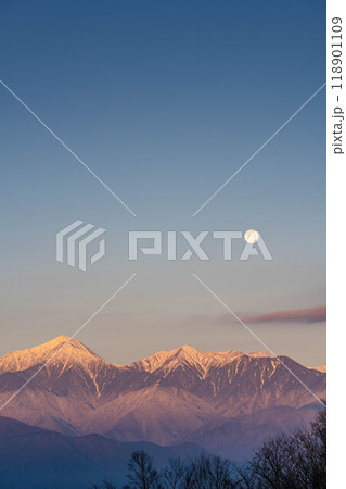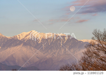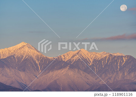 【月素材】冬の朝焼けした北アルプスと満月【長野県】