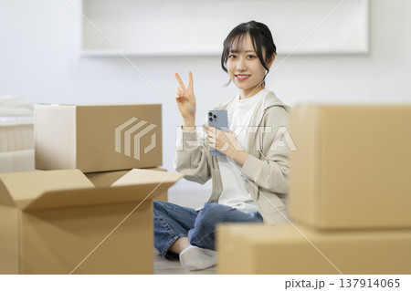 段ボール箱に囲まれて座る笑顔の若い女性(指2本のポーズ) カメラ目線 引っ越し イメージ