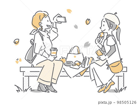 友達と桜を楽しむ若い女性 シンプルでお洒落な線画イラスト