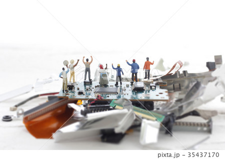 パソコンの残骸と人間のミニチュア人形