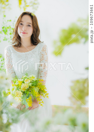 結婚式場,チャペルにいるドライフラワー,スワッグを持つドレス姿の新婦,花嫁