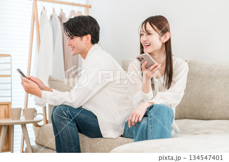 家のリビングでソファーに座りスマホを見ながら会話する若いアジア人夫婦