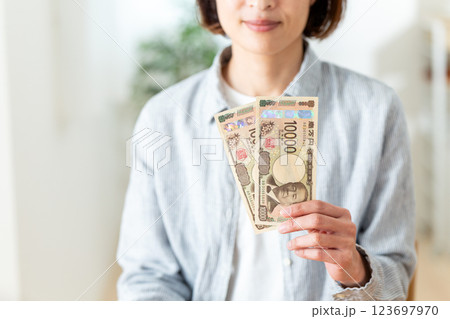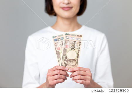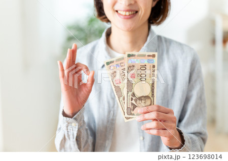 一万円札を二枚持って笑顔で丸サインをするミドル女性