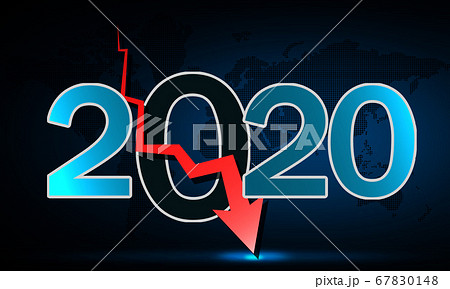 Falling red arrow and 2020 text with world map