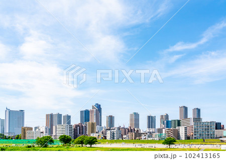 日本の東京都市景観 多摩川花火大会2025。第47回世田谷区たまがわ花火大会の会場側・奥に新宿の都庁