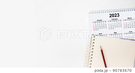 Calendar Year 2023 schedule with blank note for to do list on paper background. Flat lay with calendar, pencil on calander 2023. Close-up of a pencil on the page of a calendar 2022. isolated on white
