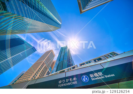 日本の東京都市景観 新風景…暑い…汐留のビジネス街や太陽光、ゆりかもめ、汐留駅…希望の光=7月20日