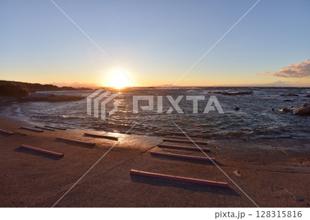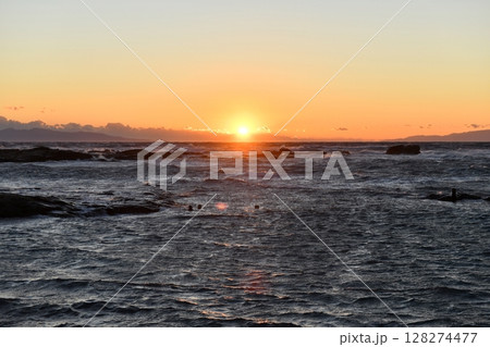 晩秋の房総半島洲崎、強風の中、伊豆半島先端に沈む強烈な太陽を臨む