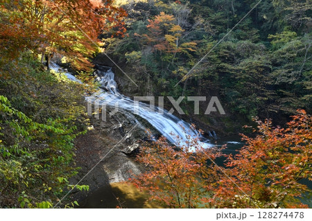 モミジが赤く染まった快晴の午後、養老渓谷金神(こんじん)の滝、滝壺から見上げる