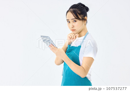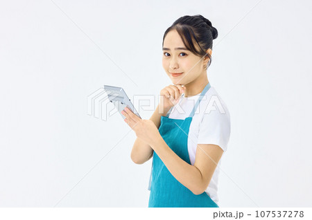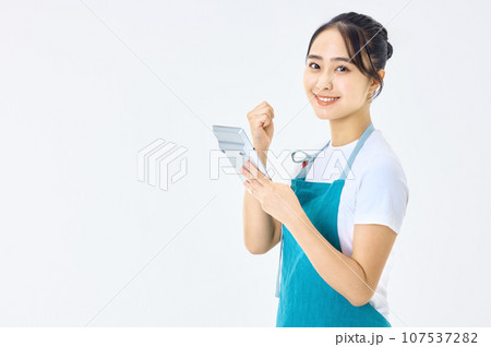 電卓を使うエプロン姿の若い主婦