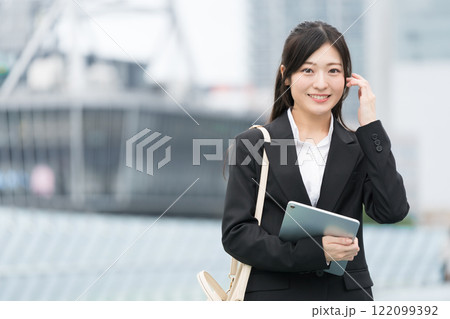 オフィス街でスーツを着てタブレットを持つビジネスウーマン