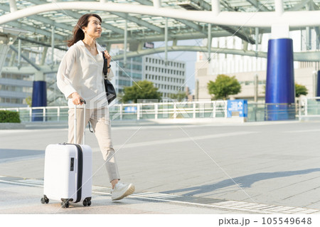 スーツケースを牽いて名古屋に出張する若いビジネスウーマン