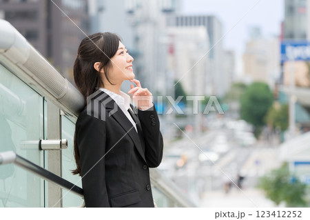 スーツを着たビジネスウーマン 新人 名古屋 栄 OASIS21 水の宇宙船にて 笑顔