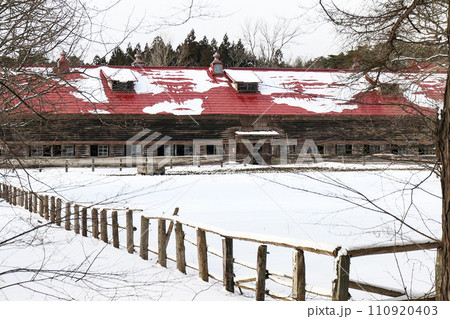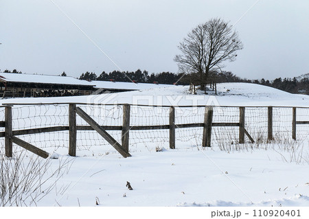 雪の小岩井農場と牧場の柵 国の重要文化財の上丸牛舎 宮沢賢治が愛した小岩井農場ふゆの