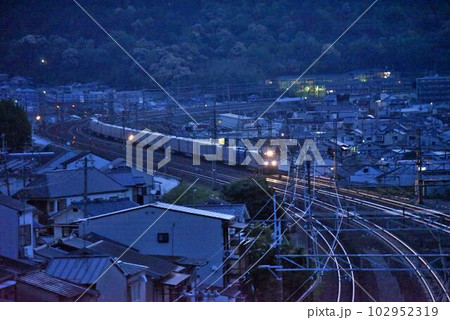 早朝の東海道本線 上牧カーブを行く スーパーレールカーゴ 高速貨物電車