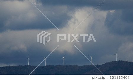雲が多い夕方の南空と山の稜線に立つ風力発電の風車・春・望遠・空主体・230318pm